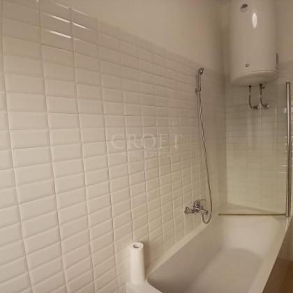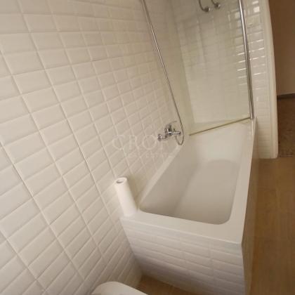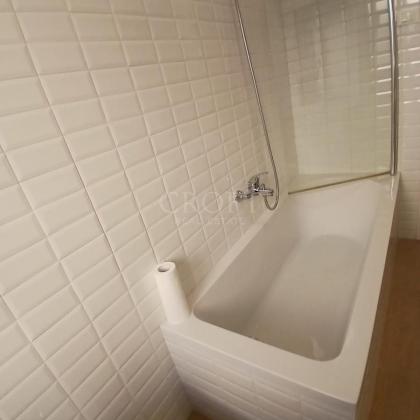 Kitchen: The apartment boasts a newly installed, modern kitchen with sleek white cabinetry, plenty of counter space, and room for a breakfast table.