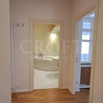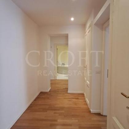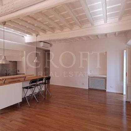 Accessed via a grand staircase or a convenient lift, the apartment immediately impresses with its seamless fusion of antique character and modern sophistication. The expansive, sun-drenched living area, illuminated by four large windows, boasts magnificent wooden-beamed ceilings and warm parquet floors, creating an inviting and cozy atmosphere.