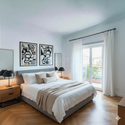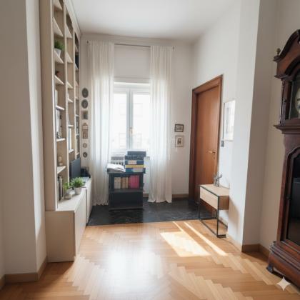 L'appartamento, luminosissimo grazie alla sua tripla esposizione che regala una vista aperta e ariosa su tutti i lati, si presenta ampie possibilità di una distribuzione degli spazi in modo estremamente funzionale. Attualmente l'attico disponde di un salone accogliente e un'ampia zona studio/libreria, una cucina, due camere da letto spaziose, una cameretta e due bagni completano la zona interna. L'immobile si presenta da ristrutturare e offre diverse possibiltà di ridisegnarlo secondo la proprio esigenza con 2-3 camere da letto, salone doppio, cucina abitabile e bagni.