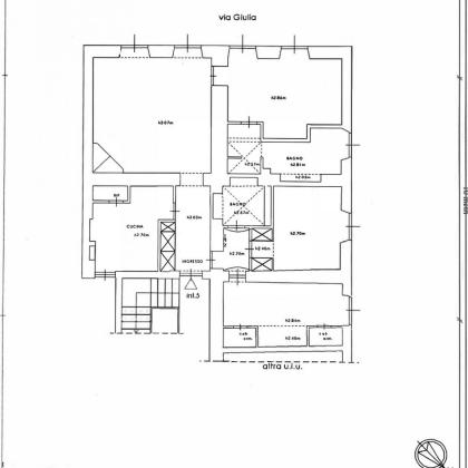 La disposizione interna è stata studiata per offrire il massimo comfort e una gestione impeccabile degli spazi. Superato l'ingresso, la zona giorno si apre in un accogliente soggiorno impreziosito da soffitti a cassettoni originali e parquet a listoni grandi. L'ambiente, illuminato da due ampie finestre con affaccio su Via Giulia, è arricchito da un suggestivo camino d'epoca (ornamentale). La cucina abitabile, sapientemente separata dalla zona living, è stata completamente ristrutturata con arredi su misura in chiave moderna e dispone di un pratico vano sgabuzzino-lavanderia.