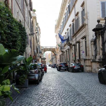 The interior layout has been designed to offer maximum comfort and impeccable space management. Beyond the entrance, the living area opens into an inviting lounge embellished with original coffered ceilings and wide-plank parquet flooring. The space, illuminated by two large windows overlooking Via Giulia, is further enriched by a striking (ornamental) period fireplace. The eat-in kitchen, skillfully separated from the living area, has been completely renovated with custom-made modern cabinetry and includes a practical utility/laundry room.