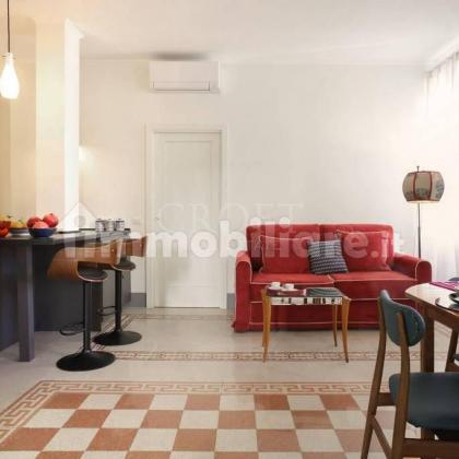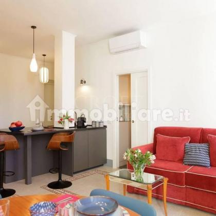 Entrance leading directly into bright living room with terracotta floors, two large windows, high ceilings and air conditioning. Well restored and nicely decorated with modern furnishings. Kitchen: Modern, completely equipped custom kitchen with dishwasher, large fridge, breakfast bar, and lots of counter and storage space.