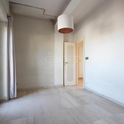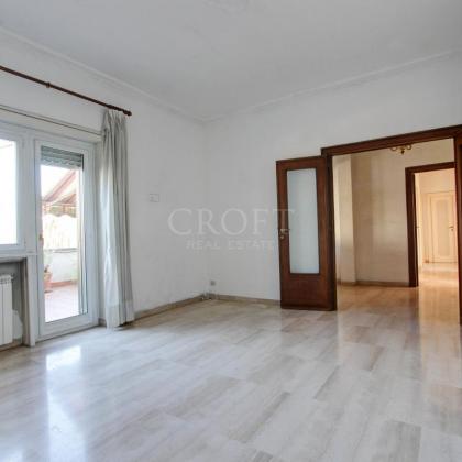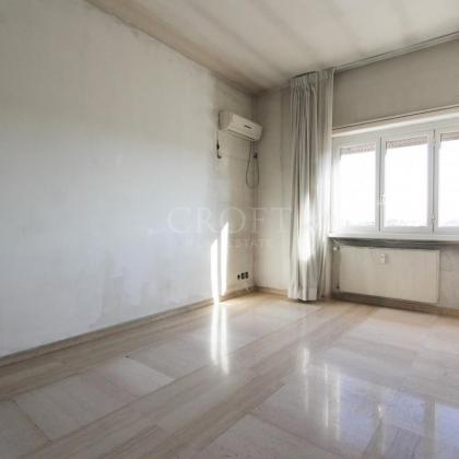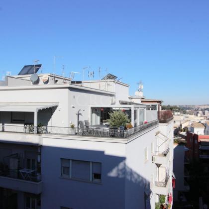 L'appartamento, luminosissimo grazie alla sua tripla esposizione che regala una vista aperta e ariosa su tutti i lati, si presenta ampie possibilità di una distribuzione degli spazi in modo estremamente funzionale. Attualmente l'attico disponde di un salone accogliente e un'ampia zona studio/libreria, una cucina, due camere da letto spaziose, una cameretta e due bagni completano la zona interna. L'immobile si presenta da ristrutturare e offre diverse possibiltà di ridisegnarlo secondo la proprio esigenza con 2-3 camere da letto, salone doppio, cucina abitabile e bagni.