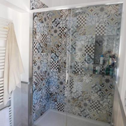 Bagno Privato: Progettato con stile con pregiato marmo italiano e piastrelle grafiche moderne, dotato di una spaziosa doccia a pioggia, lavabo, WC e bidet.