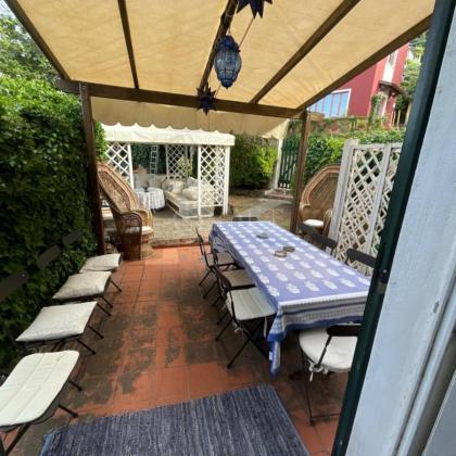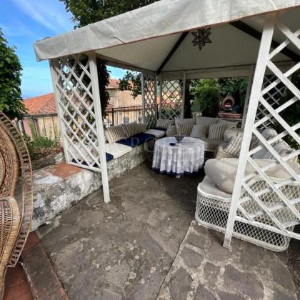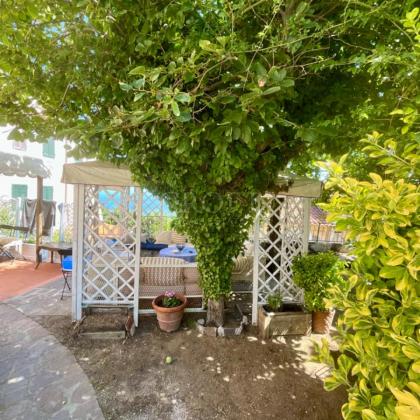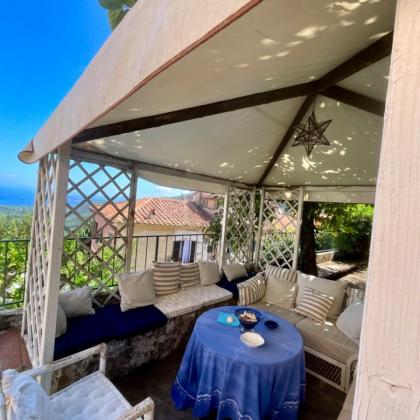 La vista sul mare dal giardino, il profumo dei boschi di castagno, il silenzio delle colline — eppure la piazza del paese è proprio sulla soglia di casa.