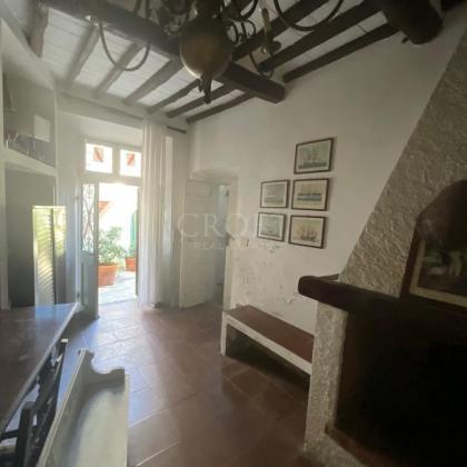 6 camere da letto e 5 bagni — Configurabile in fino a tre appartamenti indipendenti, ciascuno con ingresso proprio — Tre accessi separati: uno carrabile e pedonale dalla strada principale, due affacciati sull'incantevole piazzetta del borgo — Parcheggio privato e ampio giardino con vista mare