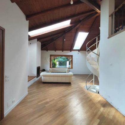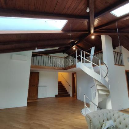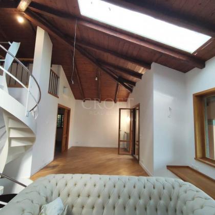 Ground Floor: The heart of the home is the expansive 80-square-meter living and dining room. With soaring ceilings, a cozy fireplace, and abundant natural light from numerous windows, this space feels both grand and inviting. Parquet floors and air conditioning add to the modern comfort. A unique spiral staircase leads to a charming loft study, offering a quiet, elevated workspace. This level features a second large living room with a fireplace, ideal for family gatherings. The space boasts a double-height ceiling and large windows that provide beautiful views of the garden. A well-equipped kitchen and a large bathroom with a bathtub are also on this floor.